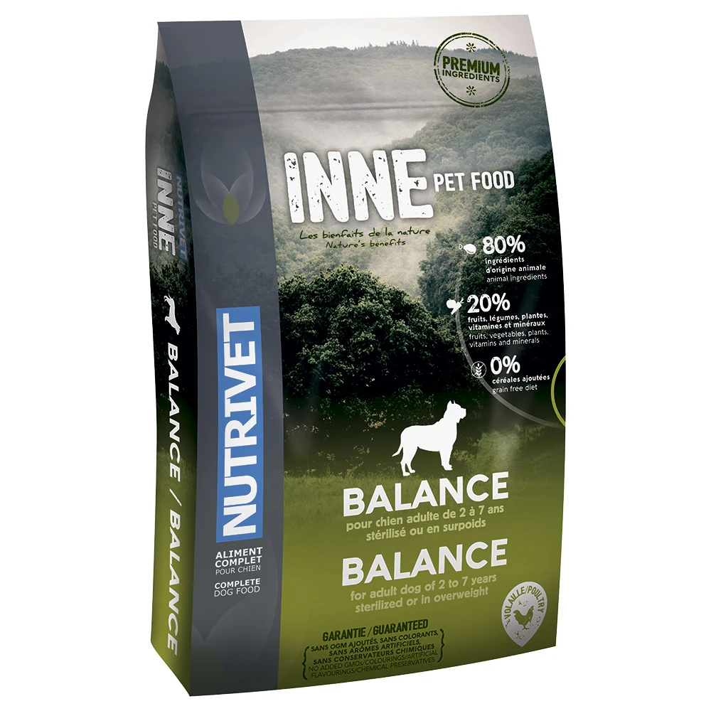 Na een sterilisatie vertonen de meeste honden een verhoogde eetlust. In dit geval, of wanneer je hond door andere redenen tot overgewicht neigt, dien je een speciaal voer met een gereduceerd vetgehalte te kiezen. Nutrivet Inne Dog Balance bevat minder calorieën dan het klassieke droogvoer en is tegelijkertijd afgestemd op de natuurlijke voedingsbehoeften van je hond. Met 80% dierlijke inhoudsstoffen en 20% fruit, groente, plantenextracten en vitaminen lijkt de samenstelling van het voer op de voeding van de voorvaderen van de hond, wat voornamelijk uit prooi en bosvruchten bestond. Ook vandaag de dag is het spijsverteringsstelsel van honden op graanvrije maaltijden met een zeer hoog aandeel aan eiwit uit vlees ingesteld. De in Nutrivet Inne Dog verwerkte soorten kip, lam en kalkoen zijn vetarm, licht verteerbaar en bijzonder lekker. Zo kan je hond naar hartelust eten, zonder overvloedige calorieën op te nemen. Naast vlees bestaat de droogvoeding uit veel verschillende waardevolle ingrediënten uit de natuur: rode biet, tomaat, chicoree en andere groentesoorten, extract uit veenbes, venkelgroen en rozemarijn en verdere plantaardige inhoudsstoffen hebben een positief effect op het organisme. Daarbij is de hoogwaardige droogvoeding vrij van kunstmatige aroma’s, kleurstoffen en chemische conserveringsmiddelen. De verwerkte zalmolie bevordert een glanzende vacht en kan het immuunsysteem versterken. Bovendien dragen glucosamine en chondroïtine bij aan de gezondheid van botten en gewrichten. L-carnitine ondersteunt de stofwisseling en kan de vetverbranding stimuleren. Een kwalitatief overtuigend en evenwichtig voer, dat de natuur als voorbeeld neemt en het beste uit de natuur in één voer verenigt. Nutrivet Inne Dog Balance Hondenvoer in één oogopslag: Premium-droogvoer voor gesteriliseerde of tot overgewicht neigende honden van 2 tot 7 jaar Vetgereduceerde formule: lekkere receptuur met minder calorieën dan klassiek voer Graan- en glutenvrij: ook bij allergieën en onverdraagbaarheden geschikt 80% dierlijke en 20% plantaardige ingrediënten: receptuur met veel vlees afgestemd op de natuurlijke voedingsbehoeften van je hond, volgens de voeding van zijn voorvaderen met prooi en bosvruchten Hoog eiwitaandeel: prioritair dierlijke eiwitten van kip, lam en kalkoen, lekker en goed verteerbaar Natuurlijk: vrij van kunstmatige aroma’s, kleurstoffen, chemische conserveringsmiddelen en genetisch gemodificeerde ingrediënten Bevat L-carnitine: kan de stofwisseling en de vetverbranding stimuleren Met zalmolie: rijk aan onverzadigde omega-vetzuren, die een gezonde huid en een glanzende vacht bevorderen en kan de lichaamseigen weerstand versterken Bevat glucosamine en chondroïtine: ondersteunt de botten en gewrichten tijdens de groeifase Rondom vitaal: plantenextracten uit groente, fruit en kruiden evenals een evenwichtige mix aan vitaminen, mineralen en sporenelementen ondersteunen het welzijn en kunnen het immuunsysteem versterken Evenwichtige darmflora: hoogwaardige ingrediënten, licht verteerbare vleessoorten, venkel, chicoree en de prebiotica MOS FOS ondersteunen het evenwicht van het maag-darmkanaal Met yucca-extract: kan de ontlastingsgeur verminderen