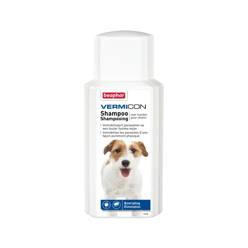 Heeft uw hond vlooien maar wilt u geen chemische middelen gebruiken? De Beaphar Vermicon Shampoo bevat de werkzame stof Dimethicon, dit is een synthetische olie gebaseerd op siliconen. De Dimethicon vormt een laagje waardoor vlooien, teken en insecten worden geïmmobiliseerd door een fysieke blokkering van hun gewrichten. Dimethicon werkt in alle levensstadia van de vlo.