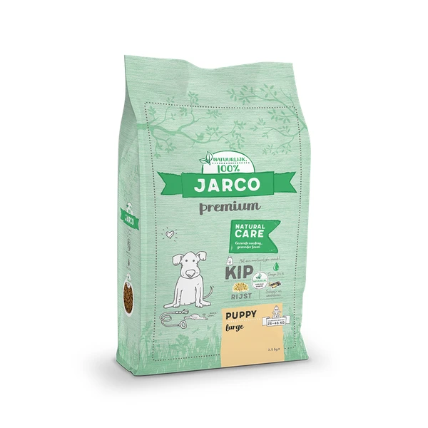 Een puppy heeft andere voedingsbehoeften dan een volwassen hond. Natural Large Puppy Kip van Jarco is een hoogwaardige natuurlijke en gezonde premium voeding, gemaakt zonder chemische antioxidanten, geur-, kleur- en smaakstoffen. Deze voeding heeft een speciaal samengesteld eiwit- en vetgehalte en de juiste mix van natuurlijke vitaminen en mineralen voor een gezonde groei en ontwikkeling van uw grote pup tot 9 maanden. Dat maakt deze voeding uitermate geschikt voor alle large rassen, met een volwassen gewicht van 26 – 45 kg.