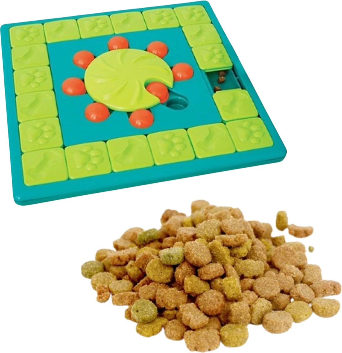 De puzzel is uitgevoerd in veilig materiaal in frisse kleuren en is zowel te gebruiken voor snacks als voor het dagelijkse voer. Bij gebruik met het dagelijkse voer voorkom je schrokken en zorg je dat de hond langere tijd actief met het zoeken naar eten bezig is, wat verveling tegen gaat en zo voor een gezondere, gelukkige hond! Naast de schuiven aan de zijkant kan de hond ook de bolletjes in het midden opzij schuiven, wat extra uitdagend is omdat de draaischijf eerst in de goede positie gezet moet worden. Ook zeer geschikt voor de gevorderde deelnemer en een ideale bezigheid voor honden die langere tijd alleen thuis moeten blijven.