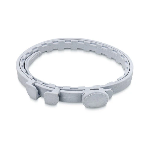 Verwijder de halsband uit de verpakking en verwijder de comfort strip. Bevestig de halsband niet te strak rond de hals van de hond. Twee vingers zouden tussen de halsband en de nek moeten passen. Haal het einde door de gesp en knip de rest van de band af op 5 cm van de gesp.